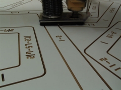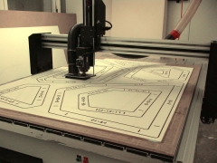 For the production of the frames the milling software “surfcam” was used. In this program the two dimensional cutting lines of the construction plans are transformed into three-dimensional milling paths by adding the thickness of the 0.6 mm thick, coated MDF (medium dense wood fibre) material. Taking to account that the CNC-mill has an imprecision of 0.5 mm to 1.5 mm, more specific information is given to the CNC-mill through an interface, e.g. type of cut, spindle speed and milling tool. With this data the program generates a machine compatible code, the so called “G-code” which can be directly processed.