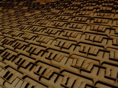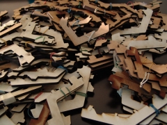 In addition to the milling process all parts are automatically numbered in an especially designed numbering pattern. The pattern clearly labels each of the individual polygonal cell elements as well as each of the several hundred connector elements. Only these labels make the correct erection of the structure possible, otherwise the 1200 final parts could not have been physically “reassembled”. For the production of the frame connectors more precise results were needed, therefore the CNC-laser with an imprecision of only 0.2 mm was used. The MDF material gets “burned” away by the focused laser beam. This way the cutting edges are hardened in order to increase the stability and solidity of the frame connectors made out of only 5 mm MDF (medium dense wood fibre) material. The results of the mock-ups and prototype tests were examined and re-evaluated. They served as basis for optimization and acceleration of the production process as well as for the refinement of the construction parts.